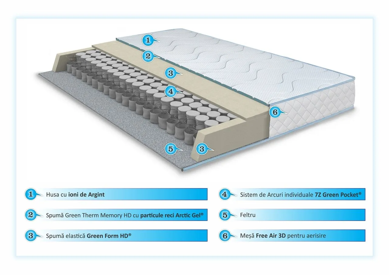 Dezvoltata de Green Future impreuna cu specialisti ortopezi, salteaua Saltea Memory Argentum Therapy Pocket 140x200cm Super Ortopedica Anatomica imbina tehnologia arcurilor impachetate individual tip Pocket cu cea a spumei elastice Green Form HD® si cele termice ale spumei Green Therm Memory cu particule reci Arctic Gel®.